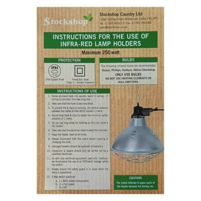 A UK Conformity Assessed (UKCA) infrared heat lamp holder, suitable for chicks, piglets, pets, or any animal requiring a heat source to keep warm. This lamp is designed to be used with screw-fitting (E27) infrared bulbs and infrared energy saving bulbs up to 250 watts. It consists of a high quality, aluminium shade with ventilation slits for optimal air circulation, a ceramic bulb socket, a 1.8 metre rubber mains cable with a moulded UK 3 pin plug, and a galvanised fixing hook with adjustable 2 metre chain for convenient hanging. This lamp also comes with a wide Ø30cm galvanised mesh guard which protects the bulb against damage and chicks and piglets etc. against burns. The Stockshop Eco Lamp Holder is also splash water-proof (IPX4) with safety insulation and very reliable. This lamp also comes with an energy saving switch that reduces power consumption by a third (33.33%) rated at 250w Max., making it ideal to use during the daytime or when the animals are a little older and don’t need as much heat.